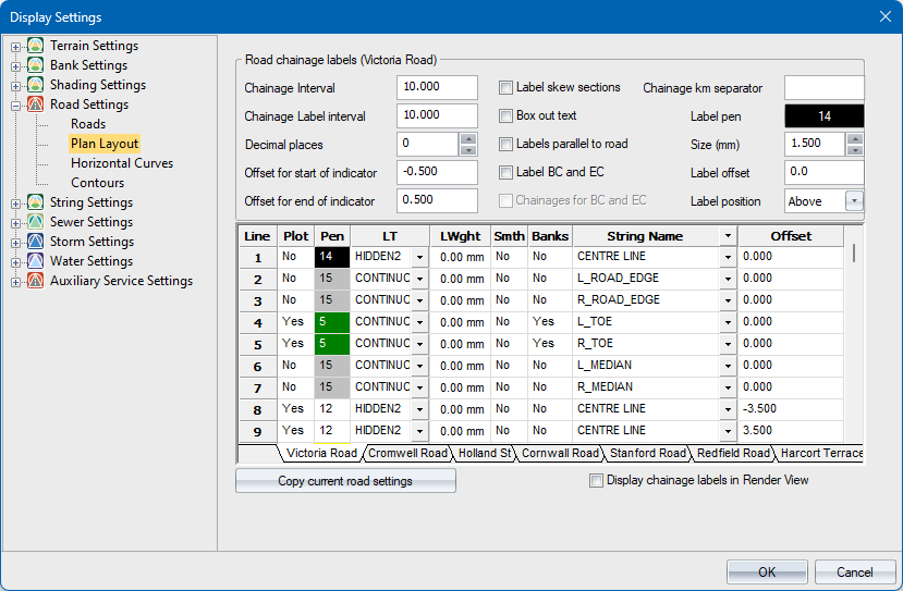Select this checkbox if you want to draw your chainage labels in Render View (defaults to OFF). This option only impacts the way you draw the roads in Render View. |