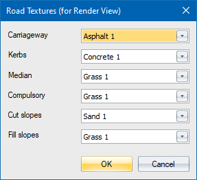 Click to show the Road Textures dialog, which allows you to change which textured materials are used to display each part of the road in Render view.