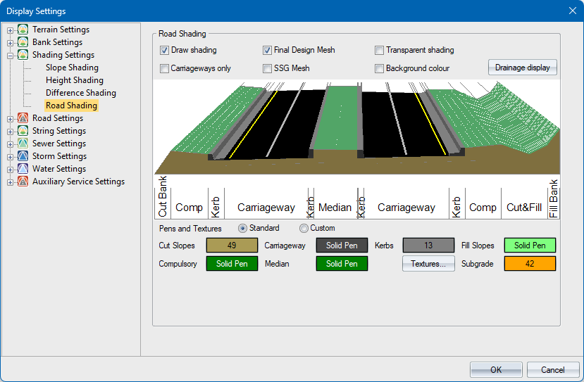 Specify the fill pen for the cut slopes that originate from the cut and fill details of the road templates. |