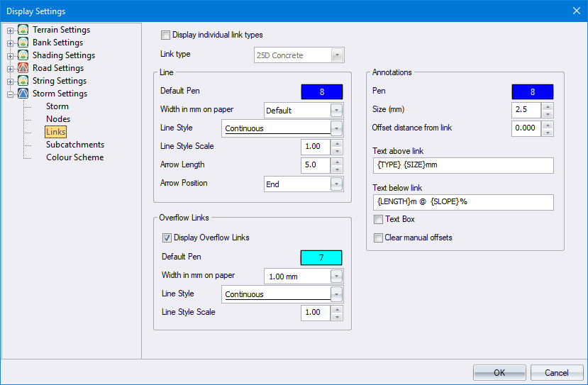 The link display settings allow you to display each individual link type with its own symbol, pen, line style and annotations.