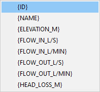 Right-click in the relevant cell to select from a menu. You can also define the number of decimals for numeric items. For example, an item {ELEVATION.1} will display the pressure release chamber elevation to one decimal. The default display is three decimals. |