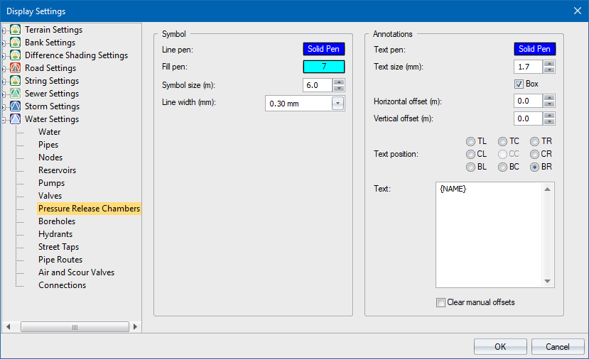 The pressure release chamber annotations are displayed in the specified colour. To change the colour, click the button and select a colour from the Colour dialog. |