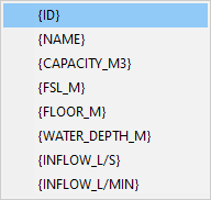 Right-click the relevant cell to select from a menu. You can also define the number of decimals for numeric items. For example, an item {CAPACITY.1} will display the capacity of the reservoir to one decimal. The default display is three decimals. |