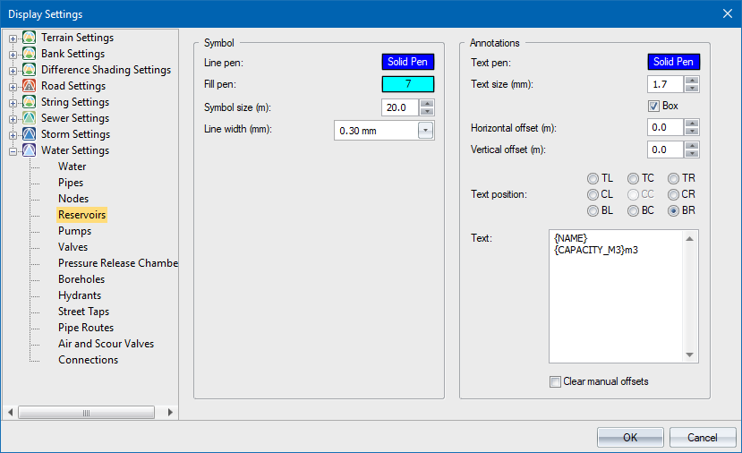 The reservoir is displayed as a symbol in the specified colour. To change the colour, click the button and select a colour from the Colour dialog. |