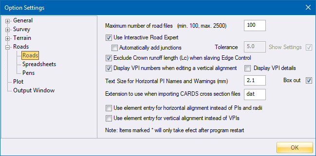 Select this checkbox to enable the Interactive Roads Expert. Before each roads operation, the program will check if there are any operations that still needs to be done before the specified operation can commence. If there are, the Road Expert will appear with the relative operations checked. Click OK to perform all the necessary operations and display the options for the specified operation. |