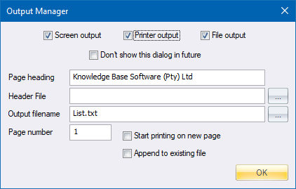 Select this checkbox to have output directed to a selected printer. If this option was selected and you now turn it off, any output previously directed to the printer will be spooled. If this option was not selected and you now turn it on, you will be asked to select the required printer. |