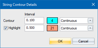 Select this checkbox to display highlighted contours. Enter the height interval at which to display highlighted contours, the pen to be used to draw the highlighted contours, and the line type in which to draw the highlighted contours. |