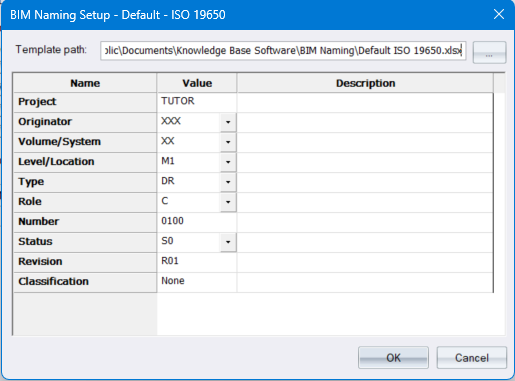 The path and filename of the Excel template used for the ISO 19650-2 BIM file naming. The supplied templates are in the C:\Users\Public\Documents\Knowledge Base Software\BIM Naming folder. However each BIM project would have its own template specified. |