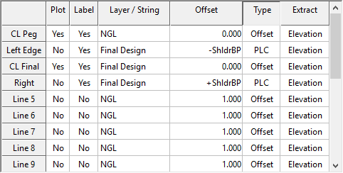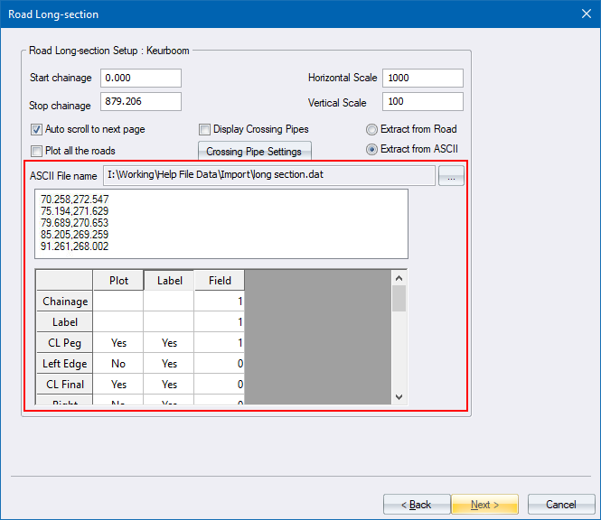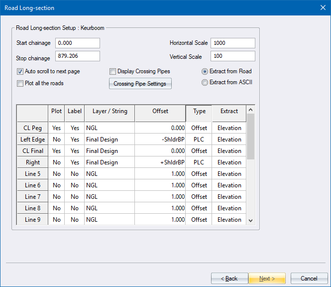 Long sections can be plotted from road data or from data in an ASCII file. Depending on where the data is extracted from, one of two options will be displayed.