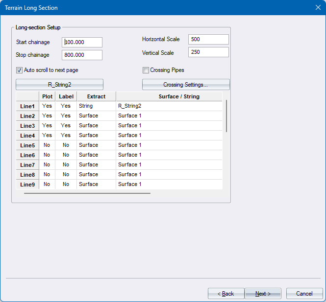 Check in order to display crossing services, e.g. Sewer, Storm, etc. on the long section. |