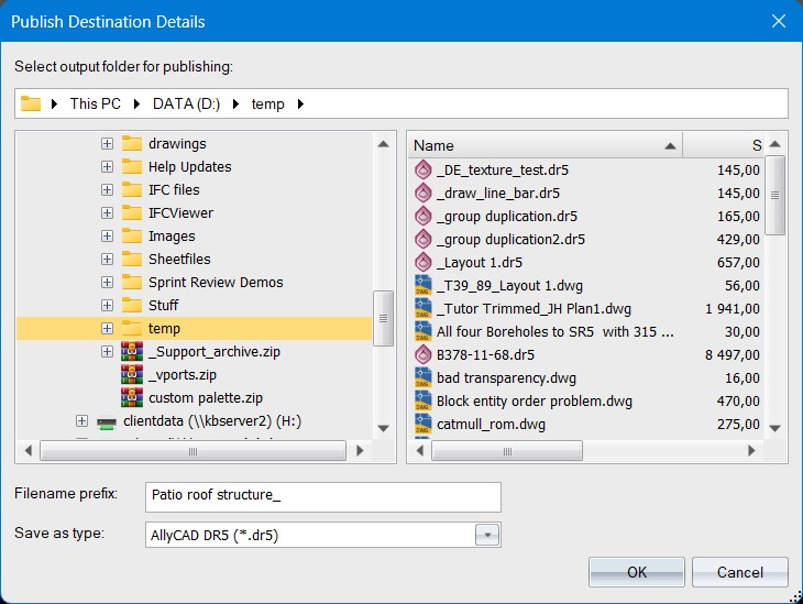The Publish function embeds all sub-drawings and blocks in the drawing files, so they can be archived independently of any exterior data. The resulting file name is a combination of the drawing name and the layout name. For example, if the layout’s name is "Detail" and the drawing file is called "My Drawing.dr4", the published file is called "My Drawing_Detail.dr4".