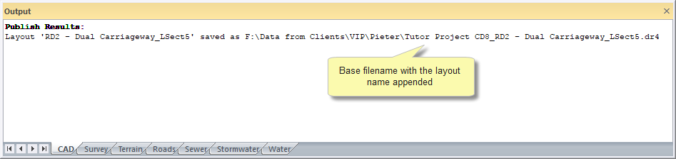 Specify the folder for the published files, a prefix for the published files, and a file type (DR5 or DWG), then click OK. The published layout(s) are saved to the folder specified, and the following displays in the Output Bar