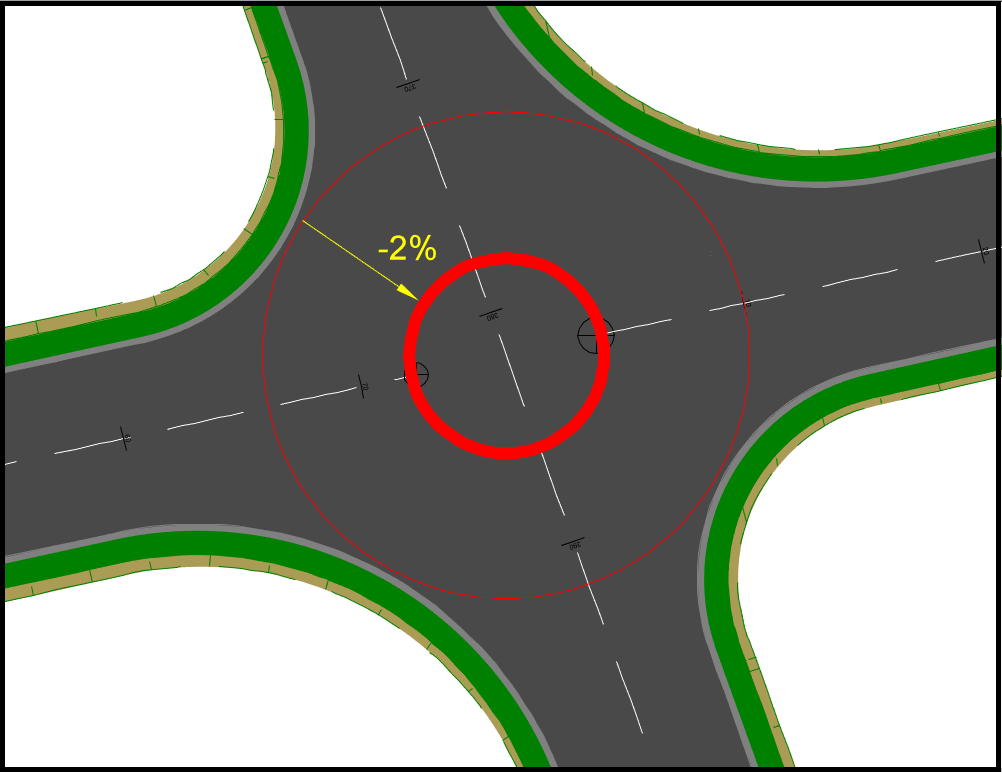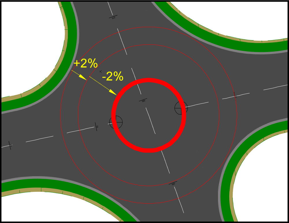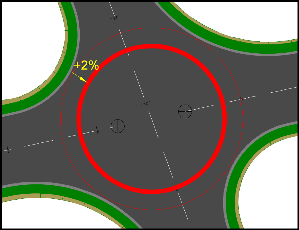 A child string will then be created at the specified grade and offsetted by a third of the roundabout lane width. This is the circle crown string. The string name will be in the format CROWN_r_n. Where: