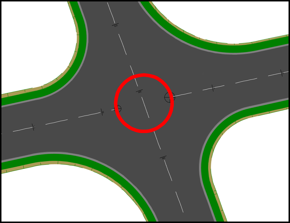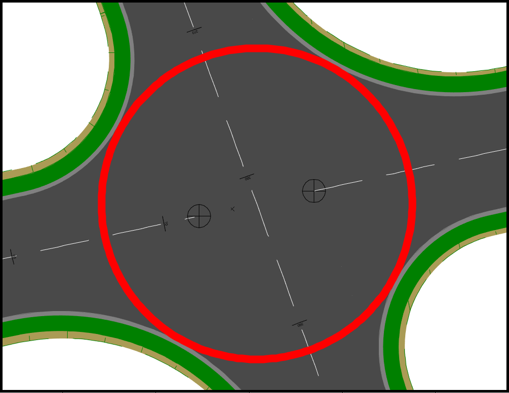 Two adjacent intersections are designed with s-curve bellmouths. The bellmouth radii will be automatically calculated such that the four bellmouths are tangential to the outer circle. This outer circle radius is equal to the circle radius plus the lane width specified in the Mini Roundabout Wizard.