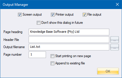 If OK is clicked and Printer output is not checked, but it was previously checked, any output that has not yet been spooled to the printer will be sent and the current document ended.