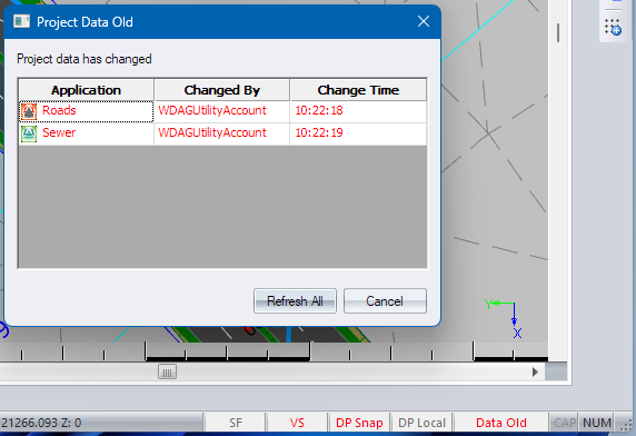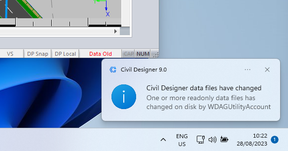 The notification that happens is a standard Windows taskbar balloon popup together with a button on Civil Designer's status bar that turns red with caption “Data Old”.