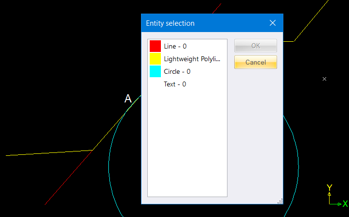 Note that the entities colour and layer will also be displayed in the Entity Selection dialog.
