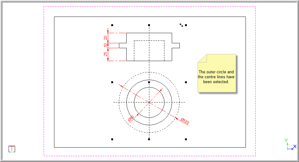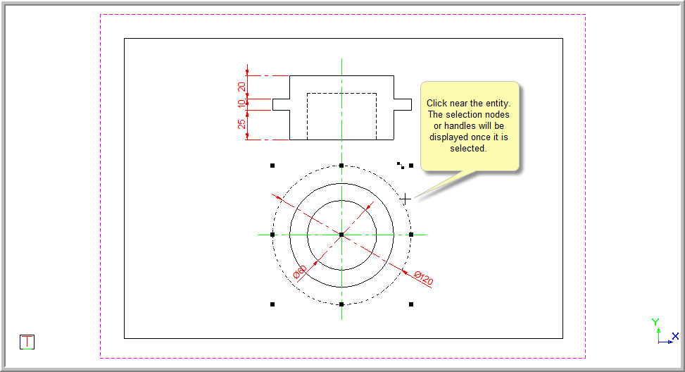 Click the entity. The selection nodes or handles display and the entity's line style is displayed as a dashed line.
