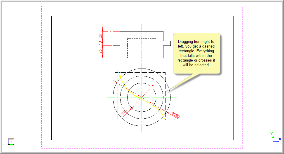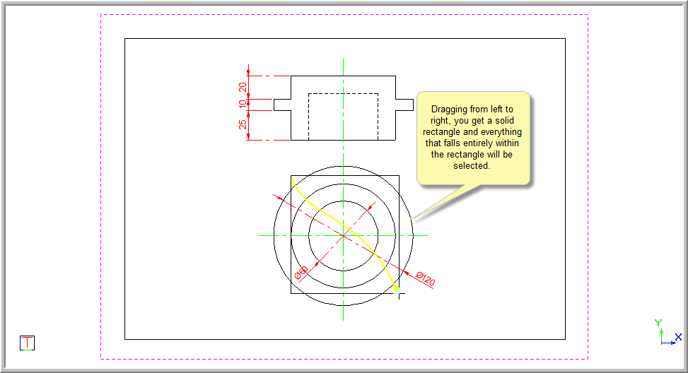 Drag a selection rectangle from left to right by clicking and holding while you drag to enclose the selection. You see a solid rectangle.