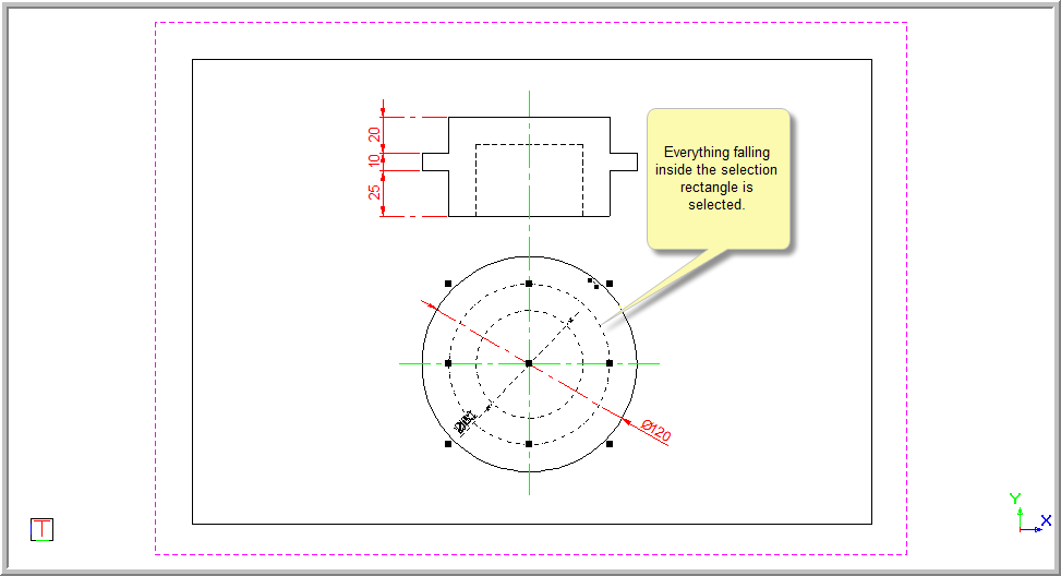 Everything that falls entirely inside the rectangle is selected.