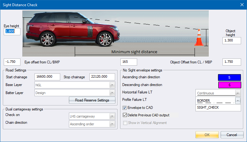 The program uses the batter cross-sections for sight checking. If the offset of the toe points is less than the specified road reserve, the program includes ground points beyond the toe point and up to the road reserve width, when doing sight distance checking.