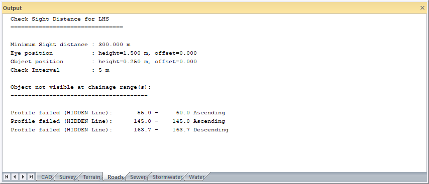 For this function to work correctly, the road design process must be completed and a final design road layer must exist. The program does sight distance checking in both horizontal and vertical planes automatically.