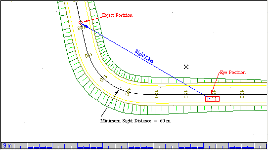 This function allows you to calculate the areas along the road alignment where the driver cannot see the specified object, over a specified minimum sight distance. These areas are marked in the specified pen colour, on either the Vertical or Horizontal alignment.