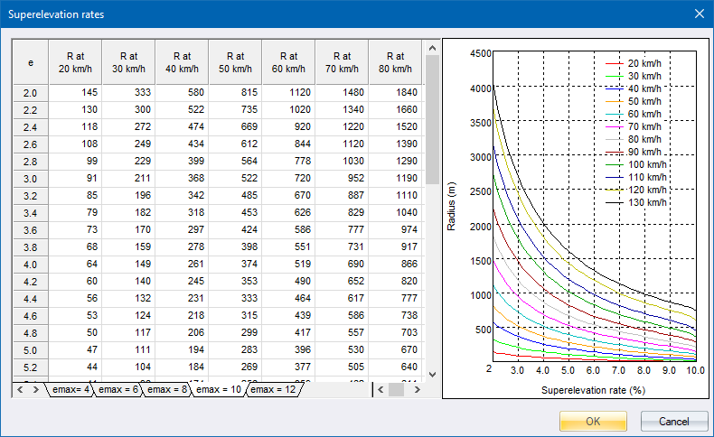 Enter the radii at each design speed next to the appropriate super elevation rate,e in percentage. When changing any of the values, the graph is updated instantaneously.
