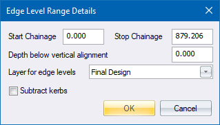You must enter the start and end chainage for the calculation, as well as the layer in the road database in which the sections should be stored. A depth below the vertical alignment can also be specified so the entire section is generated at that depth below the design line. This means that earthwork conditions and layerworks can all be calculated from the same final design grade line.