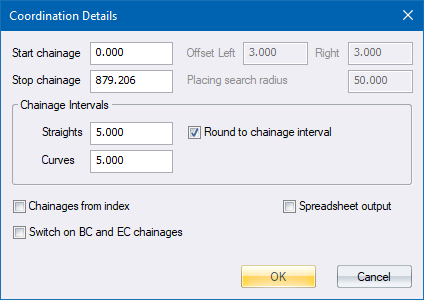 If a road database has not been created for the current road, or if there is a database but it has no chainages, then chainage intervals must be specified for both straights and curves. Chainages at the specified interval are then inserted into the roads database, along with the calculated coordinates.