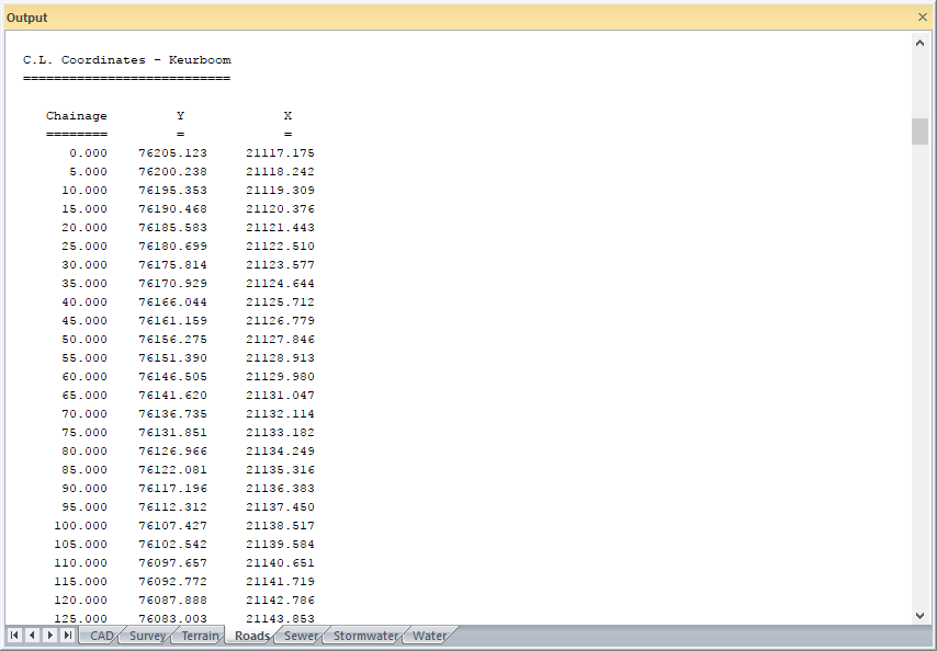 This functin allows you to coordinate the chainage points along the alignment, and produce a simple listing of the coordinates.