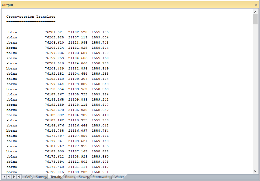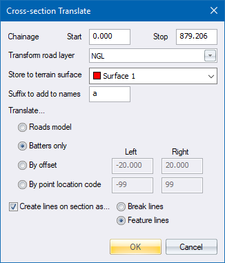 The layer from which the cross-sections in the roads file are extracted, and the terrain surface into which the generated points are added, is selected. A suffix can optionally be entered to add to the names of the points generated. By default, all the points on the cross-sections are translated to YXZ coordinates. If the Batters Only check box is selected, only the first two points on the left and the last two points on the right of the cross-section are translated (in other words, only the banks).