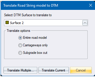 Select the DTM surface to translate the roads model to, as well as if you want to include the entire road section from left toe to right toe or just the carriageway portion.