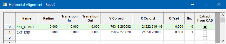 The horizontal alignment is stored in ASCII format in the design file of the active road file, and can be entered with the spreadsheet in this function or a text editor.
