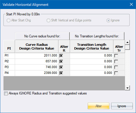 The alignment requires that the names of the start point, the horizontal P's, and the end point be entered. The radius of the horizontal curve at each PI must also be entered. A radius of 0 is calculated as a kink.
