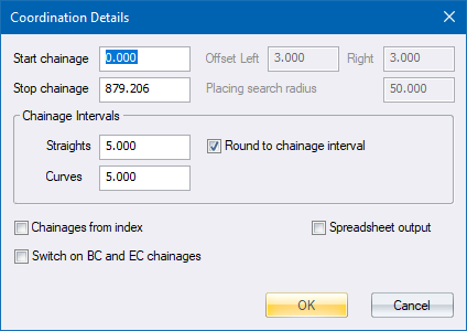 You can enter an optional offset from the actual centre line for each point. This is normally used in cases where the alignment points are not along the centre line of the road, but rather at some other point such as the left or right kerb line. Offsets to the left of the alignment are entered as negative numbers, and those to the right as positive numbers. When the alignment is stored or calculated in any way, these offsets are used to determine the correct position of the points along the centre line.