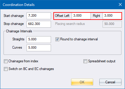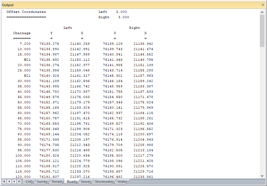 The coordinates of the points, both left and right, are listed as the chainage point coordinates are calculated. The offset points are only listed and not added to the road database.