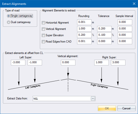 This function allows you to extract horizontal alignment, vertical alignment and superelevation data from a DTM surface, CAD lines or a strings model. These alignments can then be altered using the normal roads functions, after which a template can be applied.