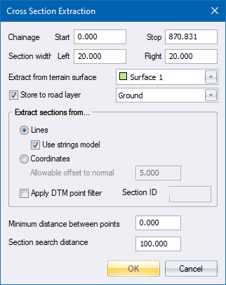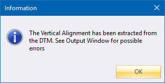 If the Vertical Alignment checkbox is selected, the program extracts the vertical alignment/s from the ground model. The calculated vertical alignment/s are entered directly into the *.des file.
