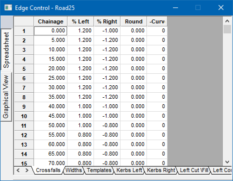 The program calculates and rounds crossfalls at every chainage. You can view the crossfall in the Edqe Level spreadsheet.
