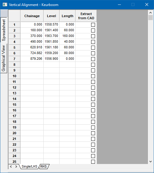 Select Single/LHS for a single carriageway; or the left carriageway of a dual carriageway road and RHS for the right carriageway of a dual carriageway road. The two alignments are graded separately. If both carriageways are to follow the same alignment, the Left carriageway should be entered and then be duplicated on the right by copying and pasting the relevant data.