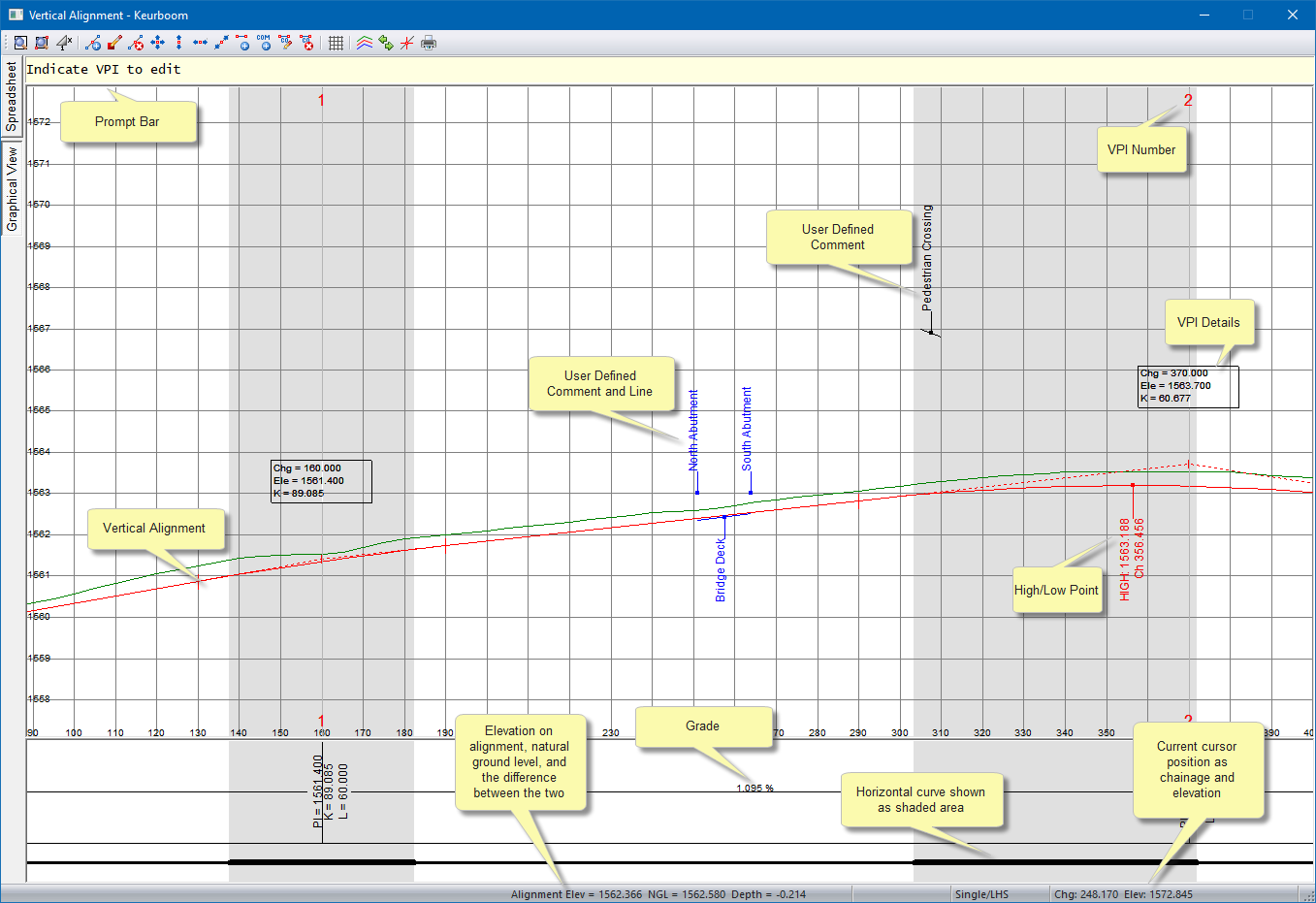 This function allows you to enter or edit the vertical alignment for the road into the spreadsheet. The vertical alignment is stored in ASCII format in the design file of the active road. The Graphical View option displays a longsection of the vertical alignment.