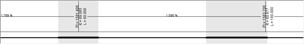 To put in a non-symmetrical vertical curve, enter a negative curve length with the fractional part of the length representing the percentage of the curve length to be allocated to the first portion of the curve. For example, if a curve length of 60 metres is required with 40 metres being allocated before the VPI and 20 metres after it, the curve length should be entered as '-60.66' (40/60 = 0.66).
