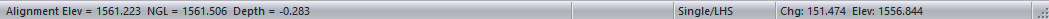 As you move the cursor, the Information Bar displays the elevation on the alignment, as well as the ground level and the difference between the two at the cursor position on the left of the Status Bar. The chainage and elevation at the current cursor position are also be displayed on the right of the Status Bar.
