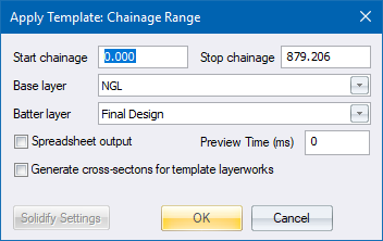 This routine is used to apply road cross section details, beyond the limits of the carriageways, by means of a template. The template would have been created in Template Editor under the Tools menu. Templates will automatically be applied at the specified skew angle for skew sections.