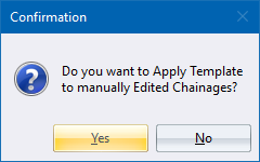 If you select Yes, all changes made to the cross-sections using the Cross Section Editor or the Edge Level spreadsheet are overwritten. If you select No,] the template is applied to all cross-sections that have not been manually edited.