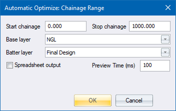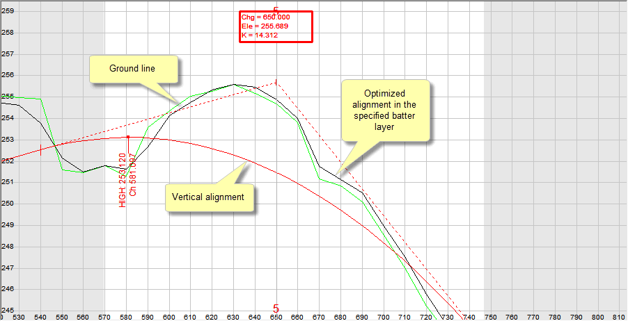 The revised profile is stored in the layer specified as the Batter Layer. This data can then be displayed in the Vertical alignment as a basis for a graphical vertical alignment design.