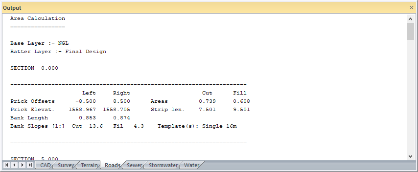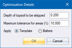 It is necessary to have two complete layers, normally a ground (base) and a road (batter) layer. The batter layer is moved up or down until the cut and fill areas balance within a specified tolerance in percent. The floating batters can either be set by their slope, or by applying a template.