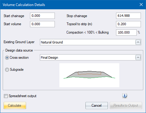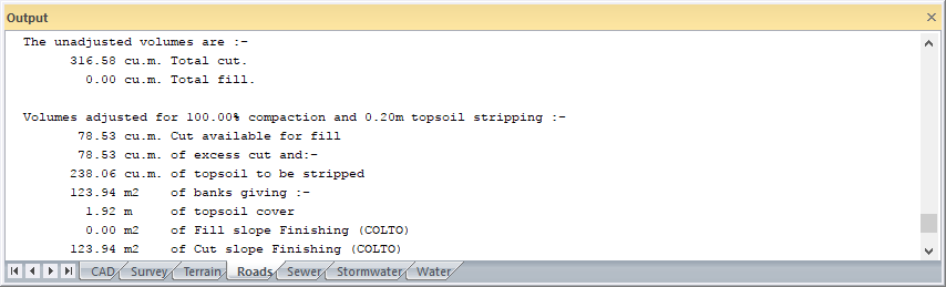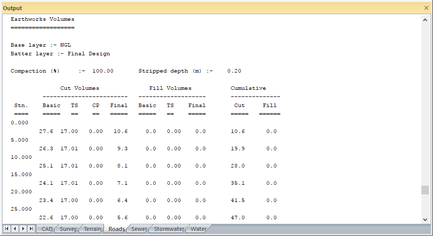 This function allows you to calculate volumes yielding a cumulative total of cut and fill. It is normally used to assess the amount of material in individual cuts or fills.