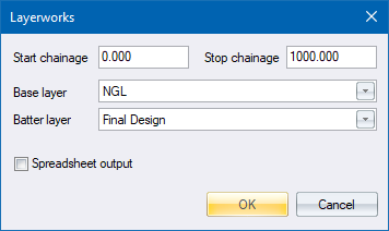The layerworks must be consistent throughout the chainage run that you want to calculate. If this is not the case, the routine stops and an error message displays.